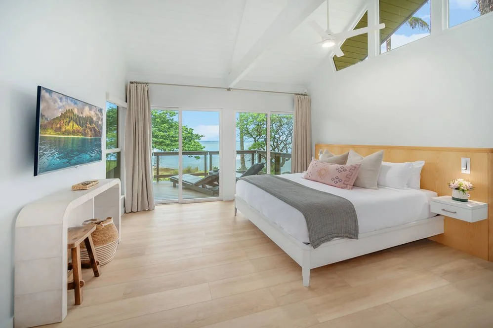 This stunning, contemporary and very private beachfront estate consists of 2 licensed vacation rental homes on over 1-acre of land. Walls of glass frame the crystal clear waters of the Anini lagoon with views of breaking waves beyond.